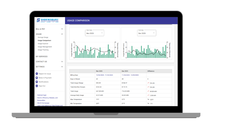 - Usage Comparison – Allows you to compare two billing periods side-by-side (such as this month vs. last month or this year vs. last year) and see how weather and temperature impact your energy use.